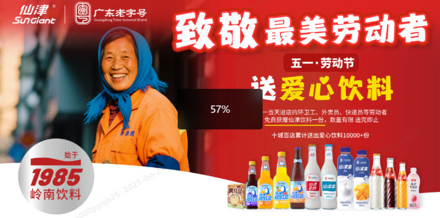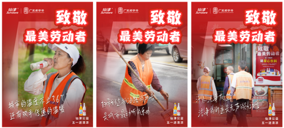 2025年5月1日,由广东仙津公司发起,仙津工会、环卫站点与爱心驿站大力支持的“致敬最美劳动者”公益赠饮活动,在全国十几个城市、数百家门店同步开展,共计送出1万份饮品。为五一期间坚守岗位的环卫工人和户外劳动者送上清凉饮品与节日问候,传递品牌温度。