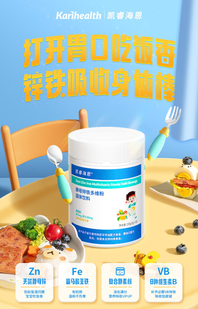 像凯睿海恩在今年新推出的这款“酵母锌铁多维粉”,科学三合一配方,精准配比了天然酵母锌+富马酸亚铁(有机铁)+8种维生素B,一袋满足孩子成长的三大刚需。一般的锌剂中,常分为无机锌、有机锌和生物锌,其中锌吸收利用率最高的为生物锌(酵母锌),其对肠胃的刺激较小,更适合身体及肠胃尚未发育成熟的儿童少年。