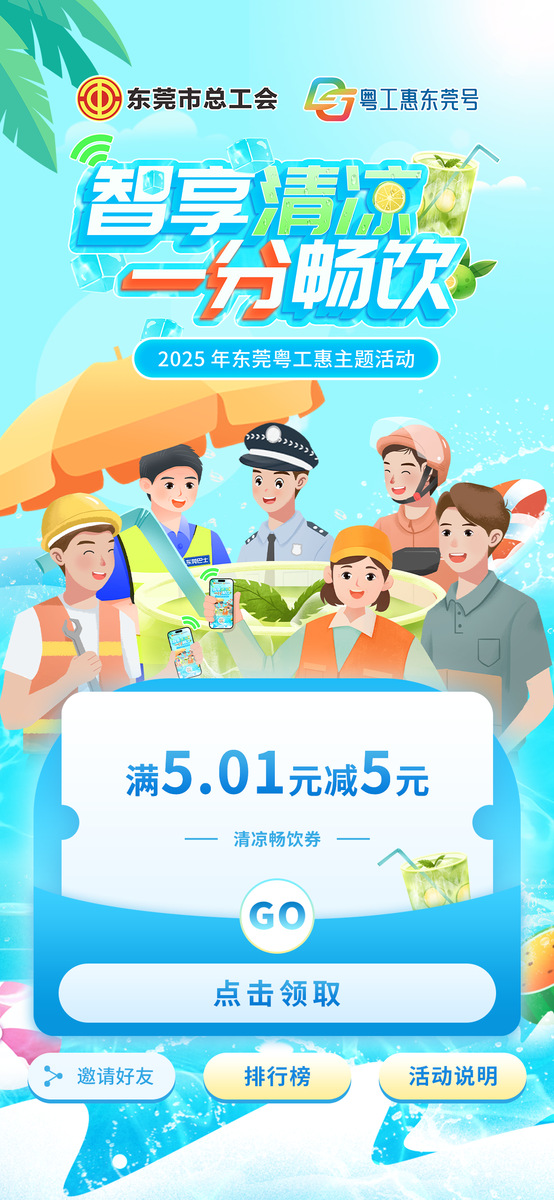 在炎炎夏日“炙烤”模式全面开启之际,东莞工会再度出手,以一场清凉“及时雨”为广大职工送去关怀。从7月7日起,东莞工会通过“粤工惠东莞号”平台,面向已实名注册的会员免费发放六万张“满5.01减5元”清凉畅饮券,活动将持续至7月16日,为期十天。这场活动旨在为高温作业环境下的劳动者提供补水消暑支持,最低仅需一分钱即可购买饮品,切实缓解酷暑带来的负担。据悉,活动每天中午12:30准时发放6000张电子消费券,会员每人每天限领一张,整个活动周期内最多可领取五张券,且券可叠加使用,最高一次性抵扣25元,大大提升了优惠的实用性和灵活性。