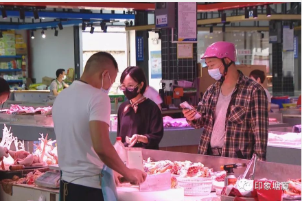 在三局农贸市场门口,首先引入眼帘的便是独具徽风皖韵的门楼,走入市场内,青年志愿者耐心地引导市民出示粤康码、测量体温,旁边的电子屏幕滚动播放着疫情防控宣传标语。