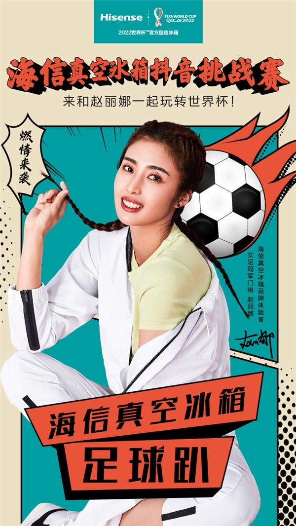 作为一名足球运动员,赵丽娜也会在“海信真空冰箱足球趴”抖音挑战赛中“本色出演”,复刻在绿茵场上的飒爽英姿,展现巾帼不让须眉的冠军实力,助力各位参赛者抱得大奖回家。同时,冠军单品海信真空冰箱560也会在“足球趴”中大秀新鲜智慧,以高颜值吸睛,以真空保鲜科技为媒,以智能科技加持,为用户勾勒出未来理想智能化储鲜蓝图,沉浸于极致鲜意中迎接四年一度的世界杯盛宴。