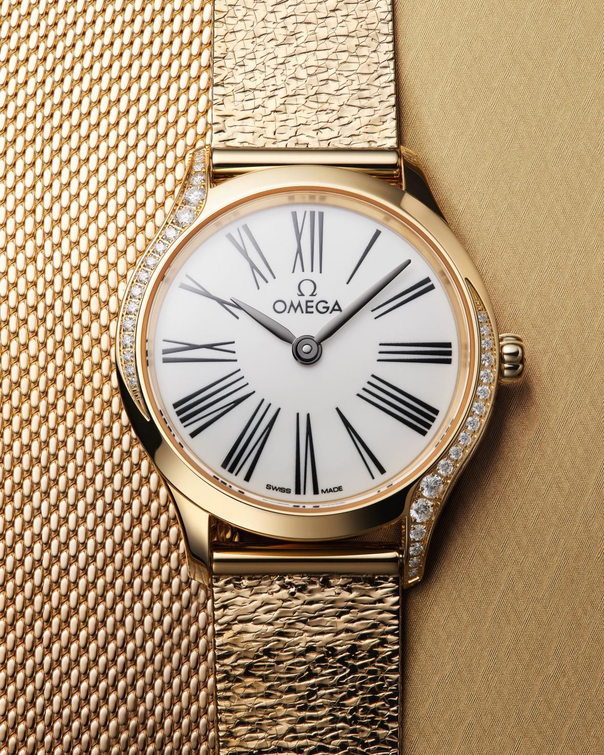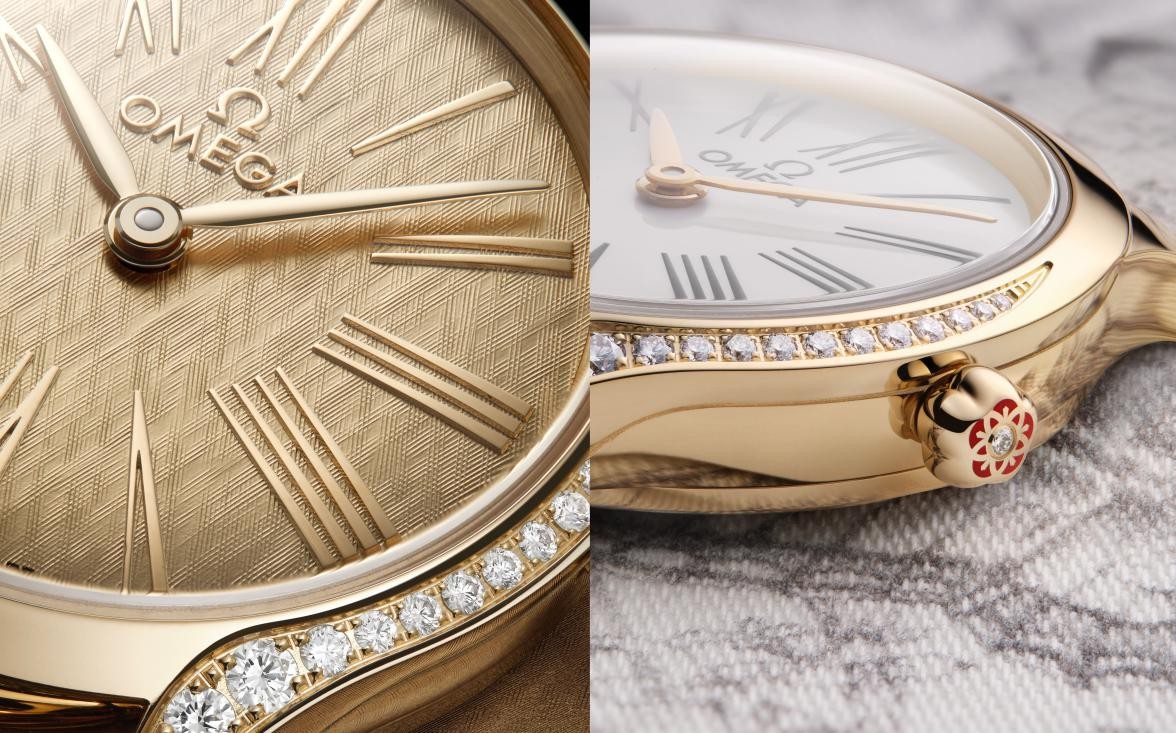 全新名典腕表包含两款由Moonshine 18K金打造的腕表,闪耀迷人。其中一款腕表的表壳、表链、指针、小时刻度甚至饰有丝绸纹理的表盘均由欧米茄独家研发的Moonshine 18K金制成,浑然一体。另一款则搭配由“大明火”工艺制成的米白色珐琅表盘,饰以经黑化处理的罗马数字刻度,对比鲜明。