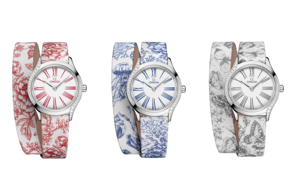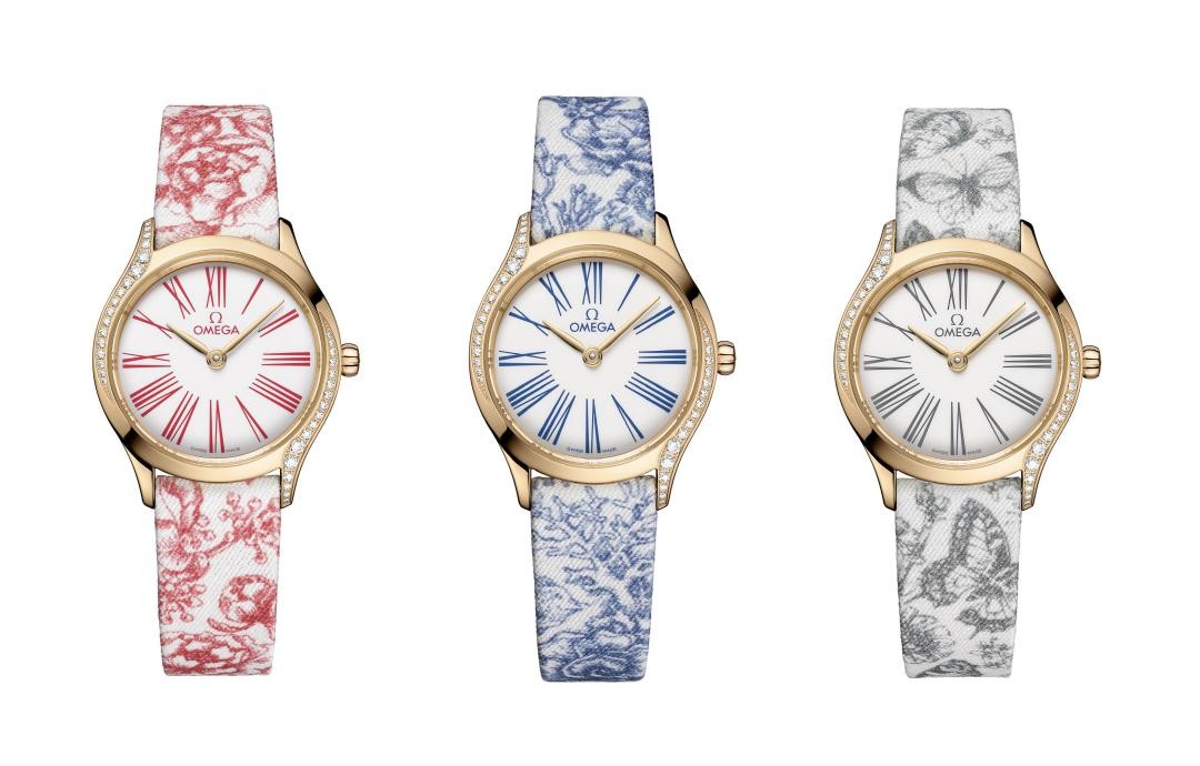 欧米茄从历史上运用在壁毯和瓷器上的茹伊印花图案中汲取灵感,设计并推出三款风格独特的“茹伊印花”表带,每一款表带的图案均与欧米茄品牌基因息息相关。其中,蓝色海洋元素致敬欧米茄与深海探索的深厚情缘,黑色蝴蝶图案象征着欧米茄支持人类航空航天探索的传奇历史,红色花卉图案则彰显品牌对保护地球家园的不竭热忱。