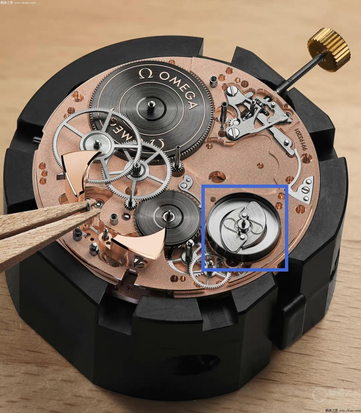 在机芯背面,可以看到追针计时部件。欧米茄在这只Chrono Chime追针报时上,使用的也是欧米茄独有同轴擒纵,并将摆频提升到36000次/时,这也是头一次。