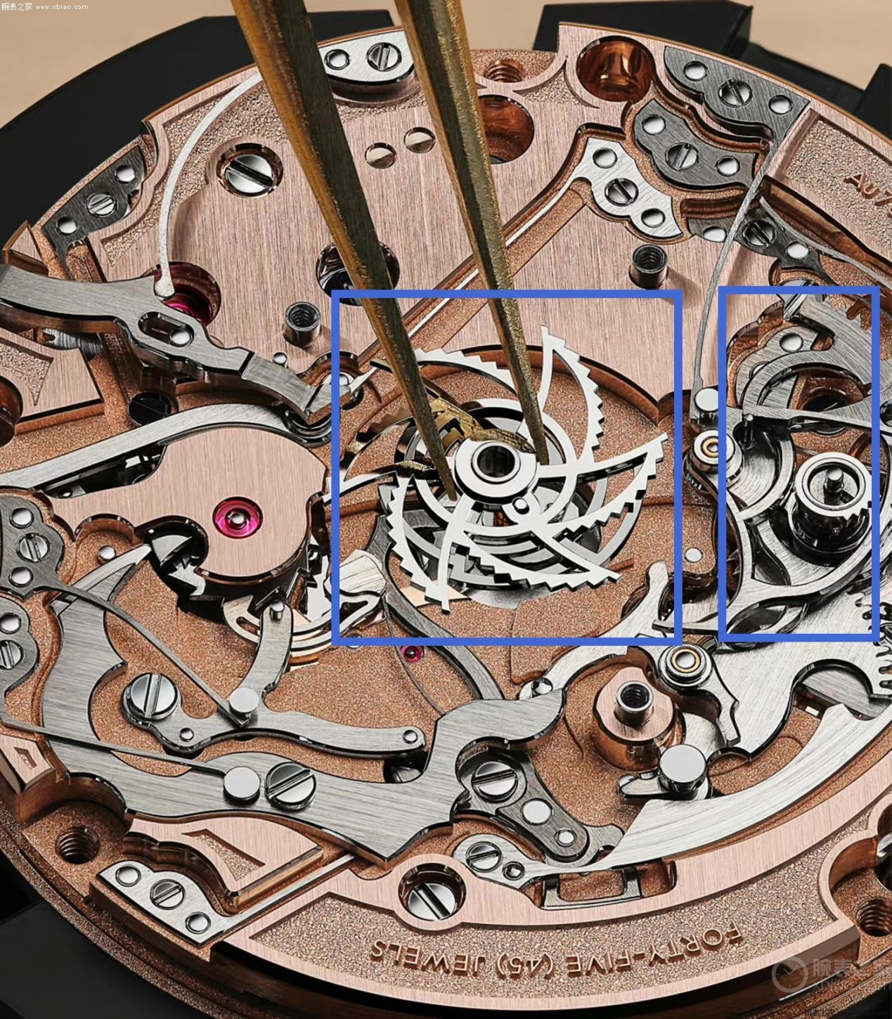 在机芯正面,除了两个音锤外,我们也可以看到三问报时的“调速飞轮”,用来控制报时的“速度、节奏”。有外媒消息表示,分钟/10秒/秒,报时间隔1.5秒,节奏连贯紧凑。