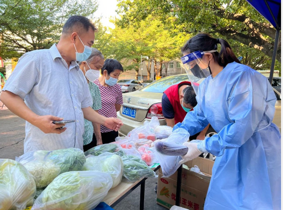 李海英告诉记者,每一天,在天还没亮的时候,她就要和同事分别去到自己负责的生活物资发放(售卖)点,做好迎接新鲜蔬菜的准备。早晨7点,蔬菜会准时运送到这里,开始整理摆卖。由于该片区实行临时管控,部分居民对物资供应有特殊需求,这里暂时购买不到,另外还有一些老人有早起买菜的习惯,他们会把居民的需求一一记录下来,反馈给商超,提前备货,全力以赴满足群众需求。每天值守工作,一天下来需要连续工作十多个小时,晚上六七点才会收摊,虽然很累很辛苦,但是能让居民一日三餐都能吃上新鲜的蔬菜,一切都值得。“菜品很齐全,质量新鲜价格便宜,做完核酸就能顺手买到新鲜蔬菜,为我们提供了很大便利。”充足的生活物资为疫情防控工作提供了坚实的后勤保障,也给居民们送去了“定心丸”。