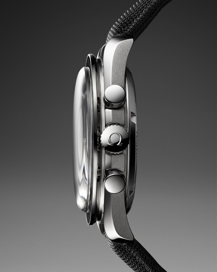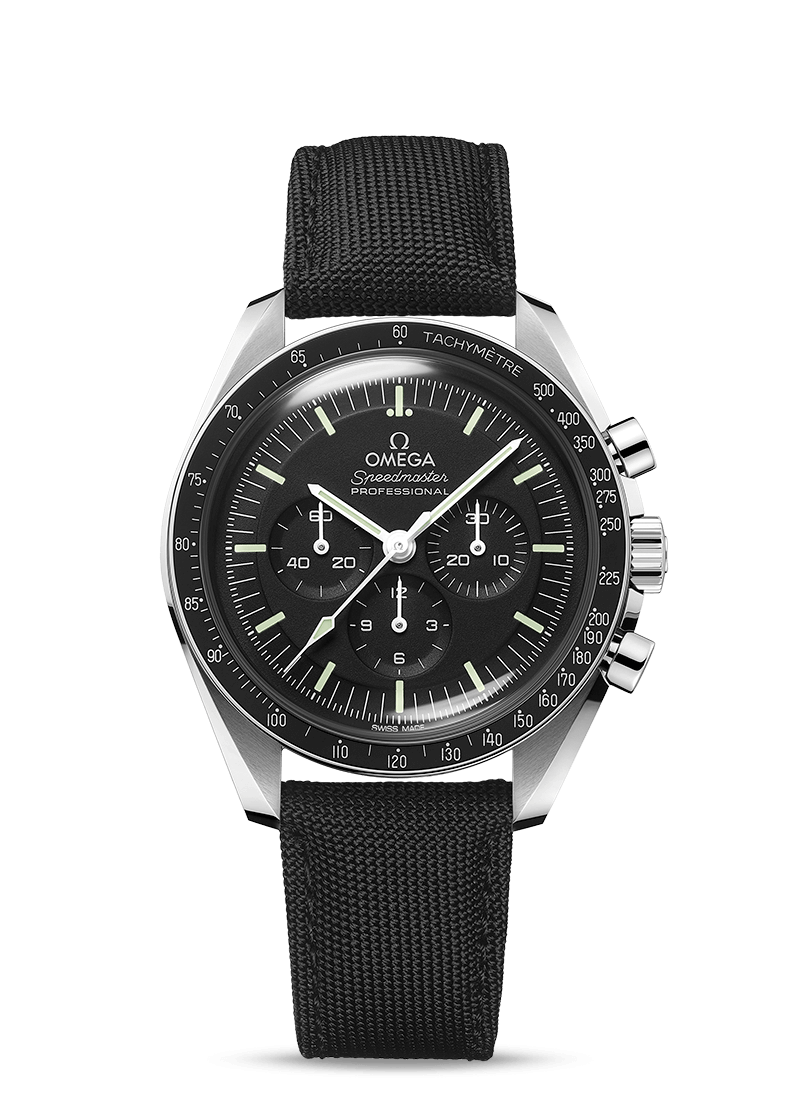 超霸42毫米专业月球表精钢款配备尼龙表带和Hesalite有机玻璃表镜。其设计灵感源自人类登月时所佩戴的第4代超霸腕表,更具有超霸的经典设计元素包括不对称表壳、黑色“阶梯式”表盘,以及表圈之上著名的“Dot over 90”标记。腕表搭载欧米茄3861至臻天文台机芯,它是全球超霸爱好者所青睐的经典表款。