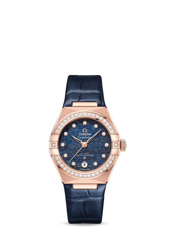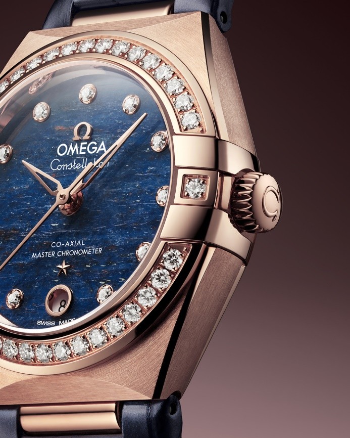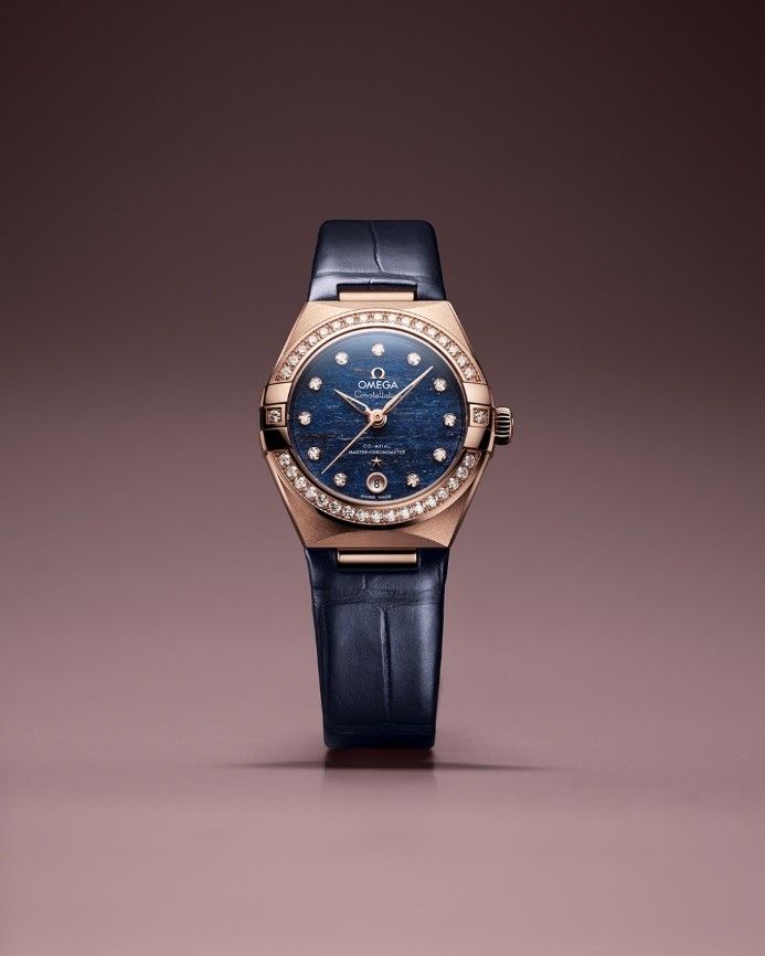 砂金石的天然的形态令每一枚腕表都光芒独具,与众不同。与砂金石表盘交相辉映的是11颗钻石小时刻度以及外圈铺镶的36颗明亮钻石,闪耀迷人。其表壳采用欧米茄独有的Sedna 18K金打造,搭配表盘同色系的蓝色皮表带。腕表内部搭载欧米茄8701至臻天文台机芯,令其整体性能尤为出类拔萃。