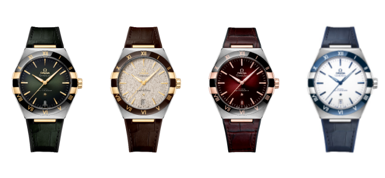 2022年,星座系列41毫米腕表再次推出全新精美的铑灰色、渐变绿色、勃艮第红色以及白色表盘。全新星座系列41毫米男士腕表在美学设计上达到了更高的造诣,表壳采用精钢、精钢-黄色18K金,以及精钢-Sedna 18K金打造,搭配蓝色、黑色或棕色抛光陶瓷表圈,表圈的罗马数字由白色珐琅或欧米茄Ceragold技术制成。