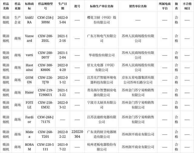 12月16日,江苏省苏州市市场监管局网站发布2022年吸油烟机产品质量市级监督抽查情况(第84期)。本次吸油烟机产品质量监督抽查共抽样10批次,其中企业抽样1批次,市场实体店购样9批次。经检验,合格10批次,合格率为100%。