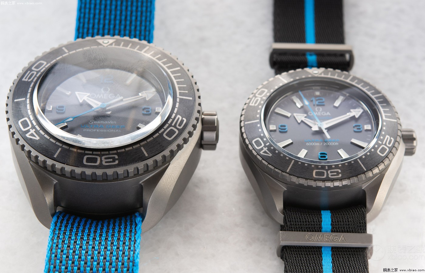 欧米茄技术验证表(左)和钛壳海洋宇宙6000米(右),可见大小差别。