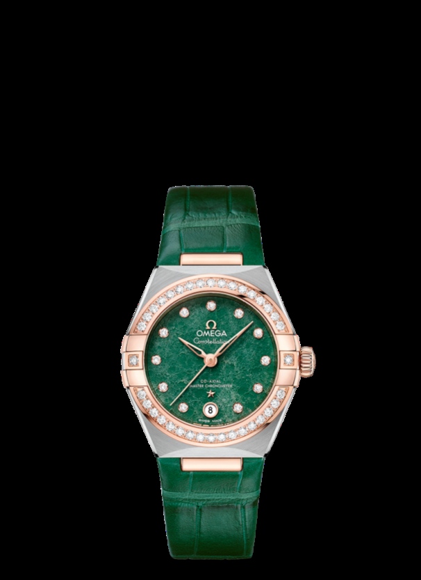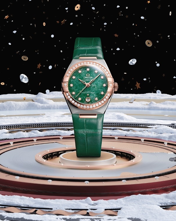 这款星座腕表采用精钢和Sedna 18K金打造,在欧米茄冬日奇境绽放璀璨光芒。绿色砂金石表盘搭配镶钻表圈,闪耀迷人,是馈赠挚爱的理想之选。
