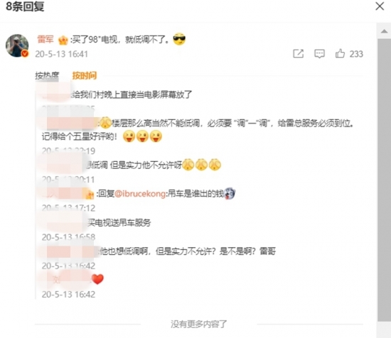 2020年,购买98英寸Redmi MAX 98的王先生安装电视时动用了吊车,在网络上引发关注。当时小米之家用了相关图片刊发了微博,雷军还评论“买了98"电视,就低调不了”。
