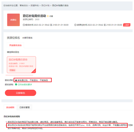 从商家版的竞价规则里了解到,京东要求参加百亿补贴活动的商品不能同时参加平台或商家的其他促销活动,包括但不限于plus、秒杀、品牌闪购、粉丝价等,不能叠加使用总价促销。更为重要的是,不允许商家在资源位上线后进行调价。