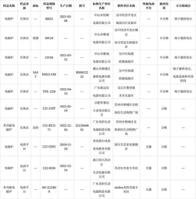 据公告,2023年上半年,苏州市市场监督管理局委托苏州市产品质量监督检验院承担电磁灶产品质量定期监督抽查任务。本次电磁灶产品监督抽查共在实体店抽样7批次,在电商平台抽样3批次,经检验,合格5批次。不合格项目为:电源连接和外部软线,端子骚扰电压。
