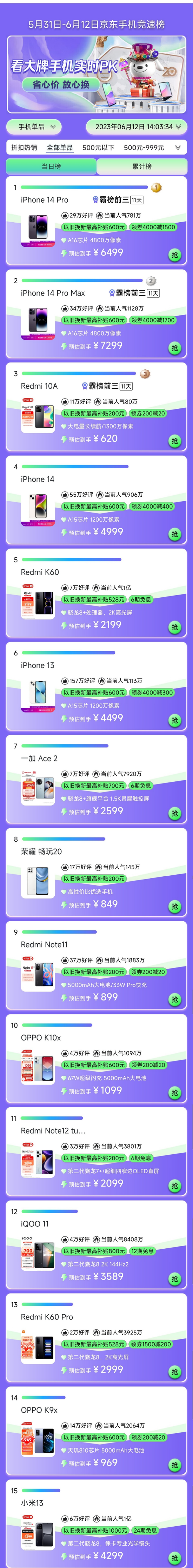 但从价位来看,本次618用一句话总结还是“苹果吃饱饱,国产厂商跟着跑”。榜单前二的iPhone14 Pro和iPhone14 Pro Max售价分别为6499元和7299元,但排名第三的redmi 10A的售价却仅为620元,两者对比价格相差了10倍。整个前十里,安卓厂商以千元机居多,唯二的两款中端机型则是小米荣耀——Redmi K60和一加Ace 2。