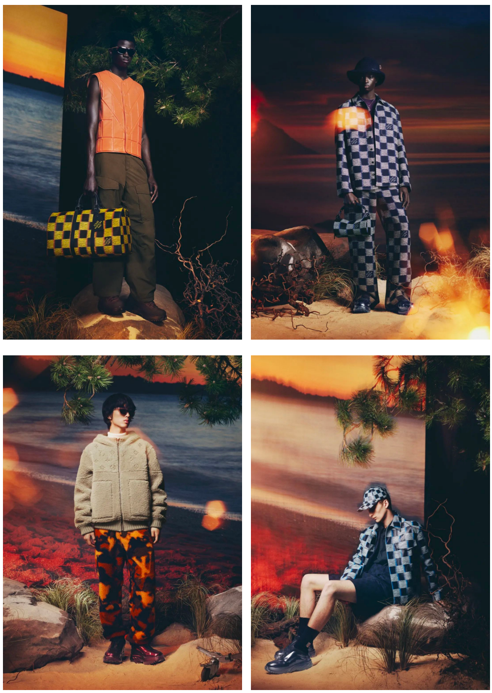 饰有Monogram图案的工装套装采用氧化植绒丹宁材质,呈现烟雾效果;Damier图案被演绎为模糊的风吹效果,旨在表现篝火周围充满波动感的空气,亦呼应Epi皮革纹理,呈现于棉毛提花工装套装、蓝色皮革夹克和羊毛拉链开衫的皮袖上。篝火的木炭色调融合在领饰牛仔夹克上,其泥土气息再现于深棕色双面羊毛夹克和卡其绿羽绒夹克。羽绒夹克取材回收锦纶,填充可持续生态羽绒,是替代传统鹅绒的环保选择。