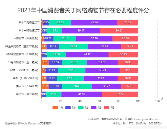 根据艾媒咨询近期的调研数据,消费者在对618、双11、年货节三大购物节日存在的必要程度评分(满分5分)中,打出4分及以上的人数分别占到74.55%、78.62%和79.19%,并且有44.61%的消费者认为618购物节活动的折扣最大。