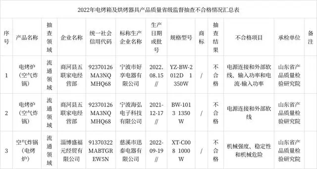 山东公布2022年电烤箱及烘烤器具产品质量省级专项监督抽查结果
