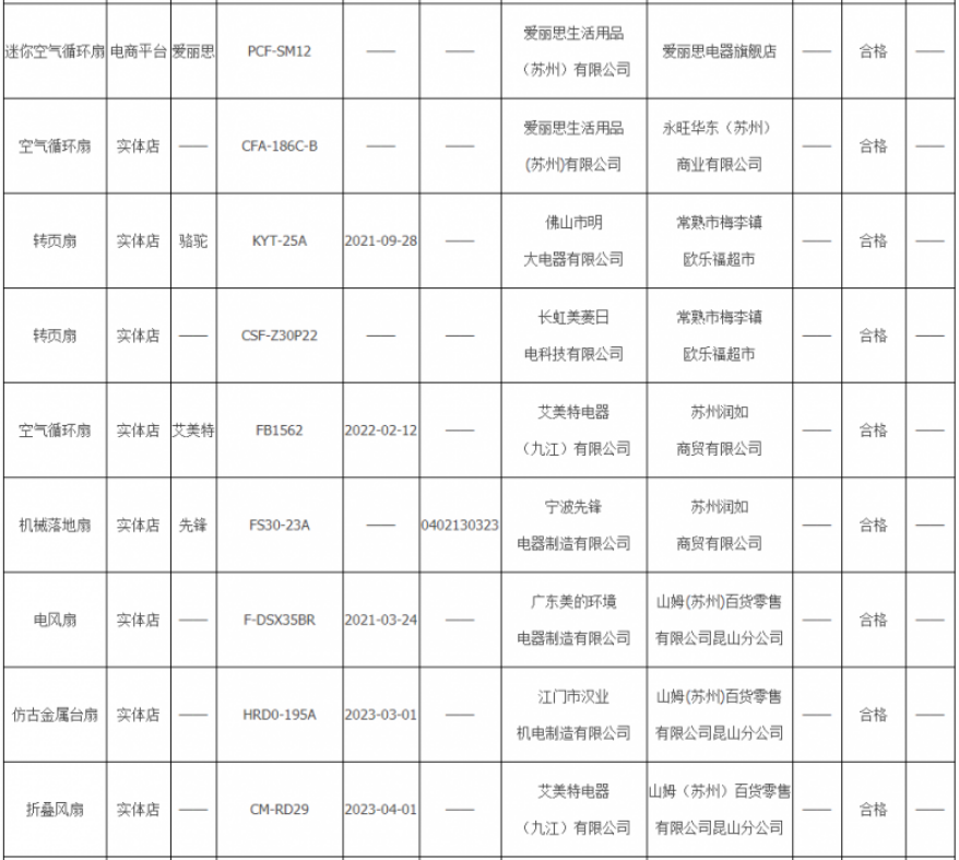 苏州市20批次电风扇产品抽查全部合格