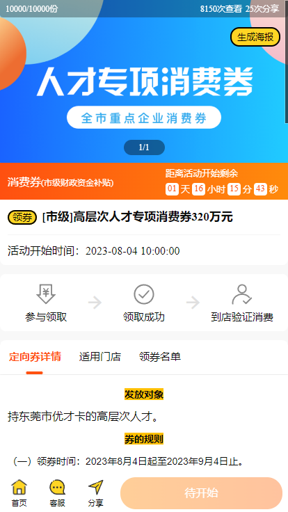 本次发券活动时间为8月4日10点-9月4日24点,明日(8月4日)起,东莞的高层次人才通过“乐购东莞”微信小程序即可领取。使用有效期:自领取后至9月4日24点,逾期失效。