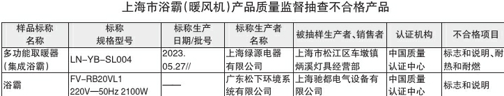 不合格产品为标称由上海绿源电器有限公司生产的多功能取暖器(集成浴霸),标称规格型号为LN-YBSL004,标称生产日期/批号为2023.05.27,标志和说明、耐热和耐燃项目不合格。标称由广东松下环境系统有限公司生产的浴霸,标称商标为Panasonic,标称规格型号为FVRB20VL1 220V—50Hz 2100W,标志和说明项目不合格。