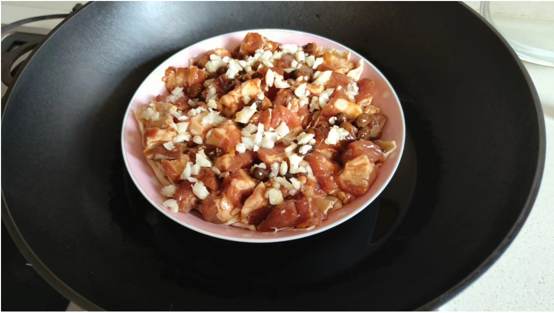 5. 锅中加入足量清水,放入蒸架,将装有食材的碗或砂锅放在蒸架上,盖上锅盖,大火烧开后转中火蒸制30分钟,直至排骨软烂入味。