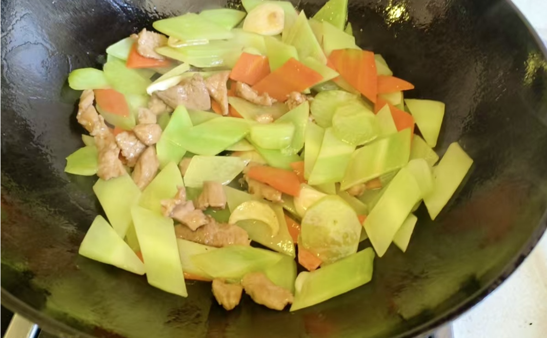 莴笋片后入锅,全程保持灶温220℃,锁住维生素C不流失