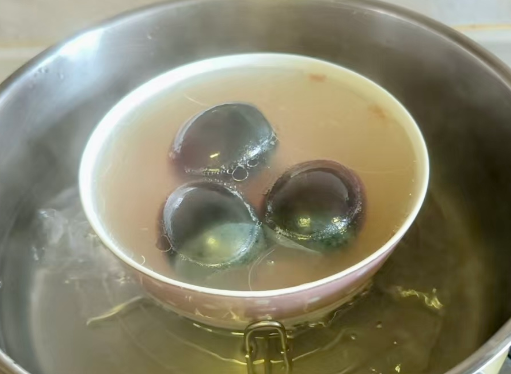 皮蛋处理:选用腌制35天的溏心皮蛋,切块后需经5秒80℃热水定型