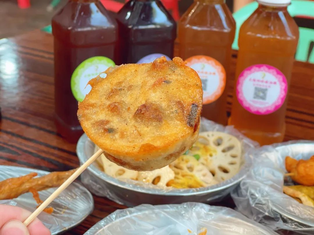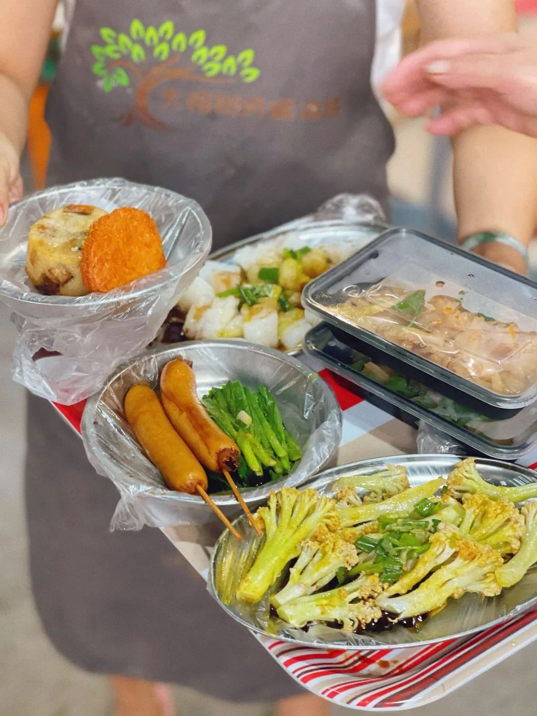 椰菜花、肠粉、火腿肠、鸡排……各式各样的食材一串串罗列,可口宜人,吃完可以饮支凉茶,解渴下火。