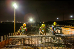 滨海湾新区重点项目建设加速推进 数名工人正在进行钢筋绑扎,远处几辆混凝土车正在进行浇筑晚上,位于滨海湾新区交椅湾板块的东湾大道项目施工现场依...