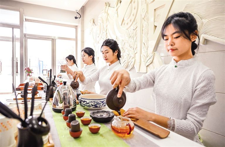 3月24日,呼和浩特市文化艺术职业学校的学生展示茶道技艺。当日,呼和浩特市、包头市中等职业(技工)学校及企事业单位职工技能邀请赛在呼和浩特市文化艺术职业学校、呼和浩特市食品与医药卫生学校等5所职业学校同步开展,赛项包括西式烹饪、中式烹饪、电子产品设计与应用等20个项目。 (记者 王磊 摄)(来源:内蒙古日报)