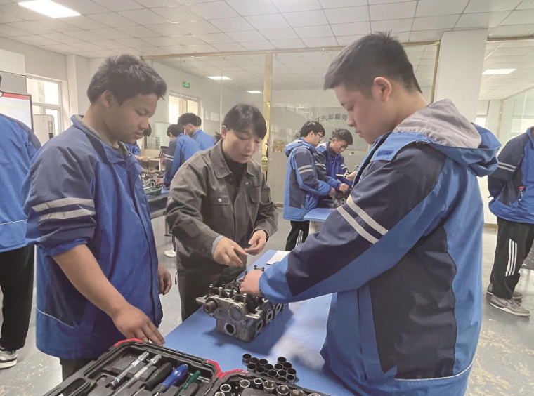 “同学们不要小看拧螺丝,气缸盖上的螺丝要遵循紧固由内而外、拆卸由外而内的原则,顺序搞反会导致凸轮轴断裂……”3月28日上午,潘凤丽按时来到芜湖电缆工业学校,给22级春季汽修班学生讲授发动机气缸盖拆装课程。课堂上,同学们按照老师要求,认真研究面前的发动机气缸盖。