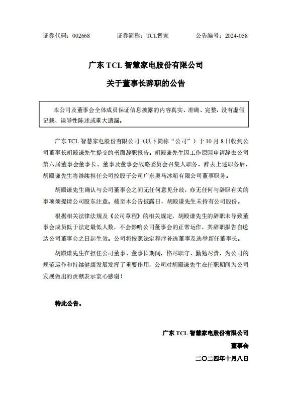 近日,广东TCL智慧家电股份有限公司发布公告称,公司董事长胡殿谦先生已提交书面辞职报告。胡殿谦因工作原因辞去公司第六届董事会董事长、董事及董事会战略委员会召集人职务,但将继续担任公司控股子公司广东奥马冰箱有限公司董事。