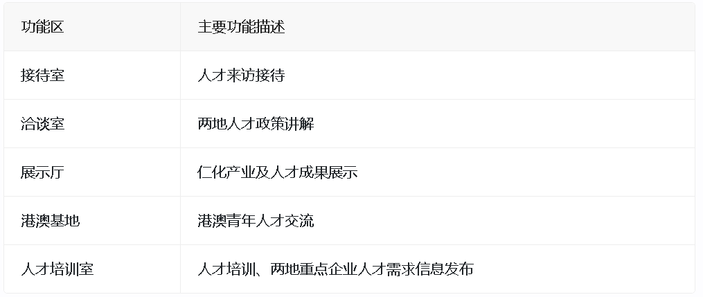 虎仁人才反向飞地服务中心内设有接待室、洽谈室、展示厅、港澳基地、人才培训室等五大功能区,旨在为两地人才提供全方位的服务。这些功能区将承担起人才来访接待、两地人才政策讲解、仁化产业及人才成果展示、港澳青年人才交流、人才培训以及两地重点企业人才需求信息发布等综合性功能。