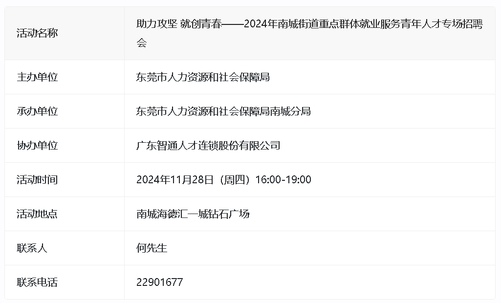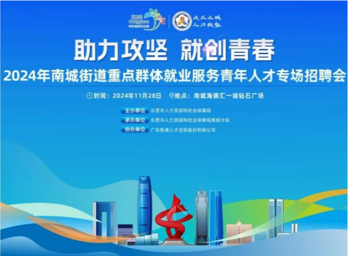 东莞市人力资源和社会保障局与东莞市人力资源和社会保障局南城分局定于2024年11月28日(周四)16:00-19:00在南城海德汇一城钻石广场联合主办“助力攻坚 就创青春——2024年南城街道重点群体就业服务青年人才专场招聘会”。此次招聘会旨在为青年人才提供就业帮扶,助力其实现职业梦想。