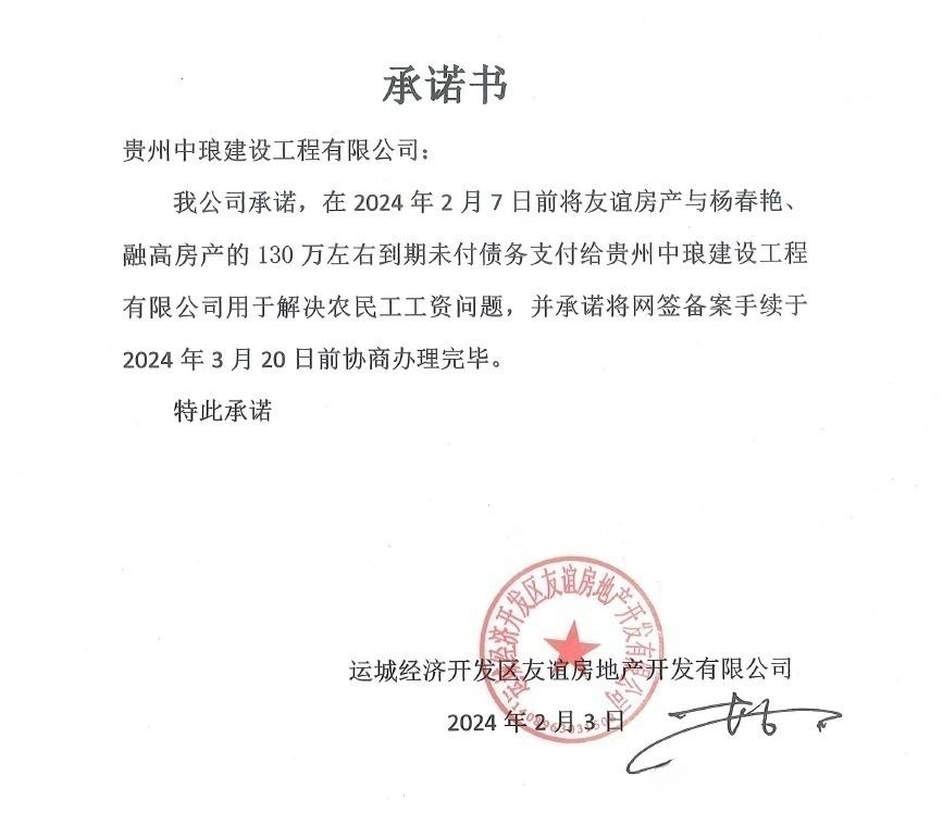 受访者提供资料“拖欠工资的事情,我们也很无奈。目前共拖欠工资300多万元,涉及160来名工人。”贵州中琅公司负责人李艳向中国工业报证实确实存在拖欠工资的问题。李艳介绍称,2023年7月16日,该公司与友谊房产公司签署施工合同,包工包料承建友谊公馆2号楼二次结构等工程。双方合同约定,工程款支付方式为以房抵工,折抵友谊公馆2号楼房产32套4109.32平方米,每平方米作价4500元,折合人民币18491940元。友谊房产公司按施工进度办理房产折抵手续,在开始施工2个月内办完所有相关手续。其间,友谊房产公司提出,该工程作为保交楼项目,要求缩短工期,经双方协商,计划竣工日期由2024年5月15日,提前至2023年12月31日。工程如期完工,薪资却没了着落。2024年1月,已临近春节,遭欠薪的农民工向贵州中琅、友谊房产公司讨要工资,并向运城经济技术开发区管委会等相关部门反映欠薪问题。“按照合同,友谊房产公司应在开始施工之后的2个月内办完房产抵项的所有相关手续。但房产抵顶手续一直无法正常办理,无法进行网签备案。房产无法网签就无法变现,资金积压在项目上,导致公司无力解决农民工工资问题。”李艳说。