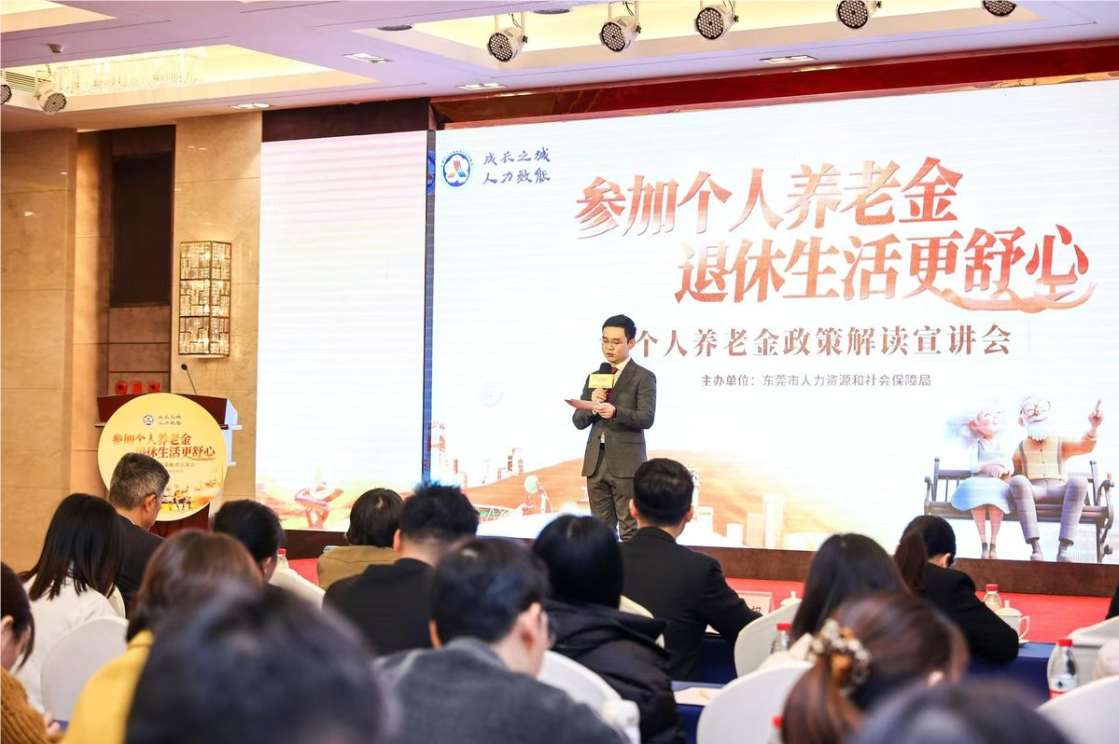 为宣传和普及个人养老金相关惠民政策,提升群众对多层次、多支柱养老保险体系的科学认知,东莞市人社局于12月16日举办了以“参加个人养老金,退休生活更舒心”为主题的个人养老金政策解读宣讲会。本次宣讲会旨在全面推动个人养老金制度在东莞落地实施,通过政策讲解和现场咨询等方式,提高参保单位代表和广大市民对个人养老金制度的认知度和参与度。
