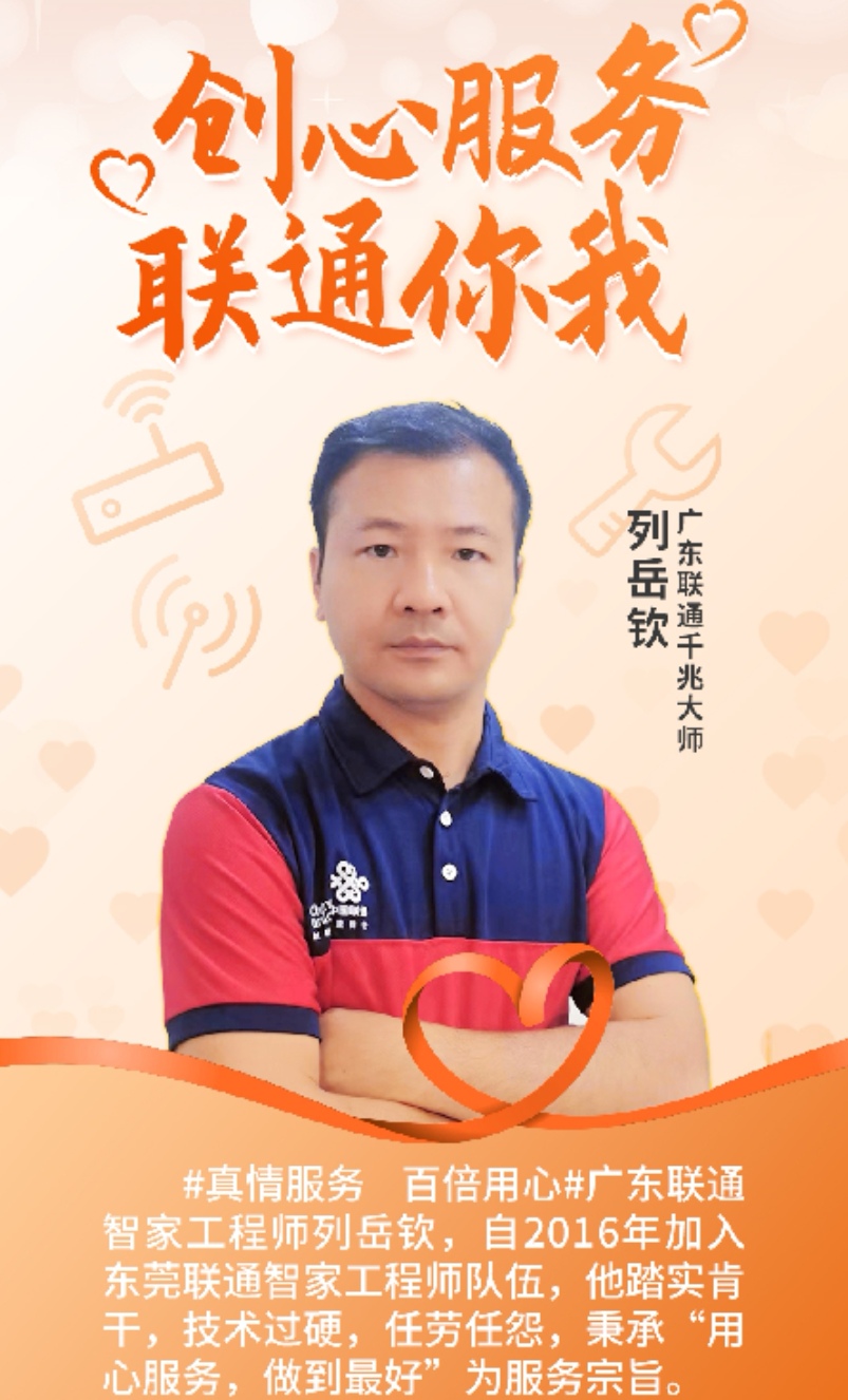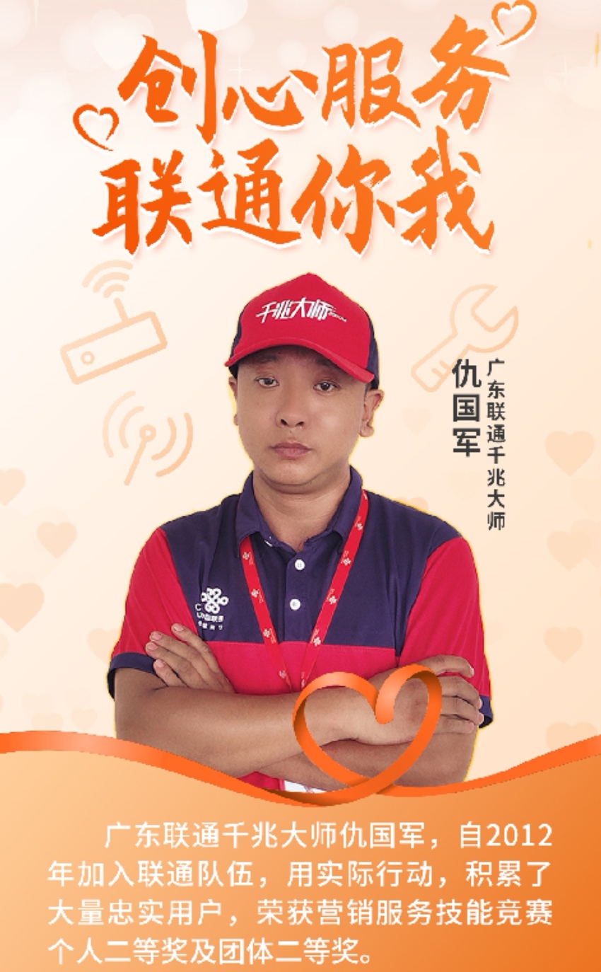 东莞联通智家工程师仇国军始终将“为客户提供最优质的服务”作为座右铭。入职多年来,他是智家工程师的一面旗帜,严于律己,心系客户,以自己的方式默默地服务着客户,在平凡的岗位承载着非凡的使命。