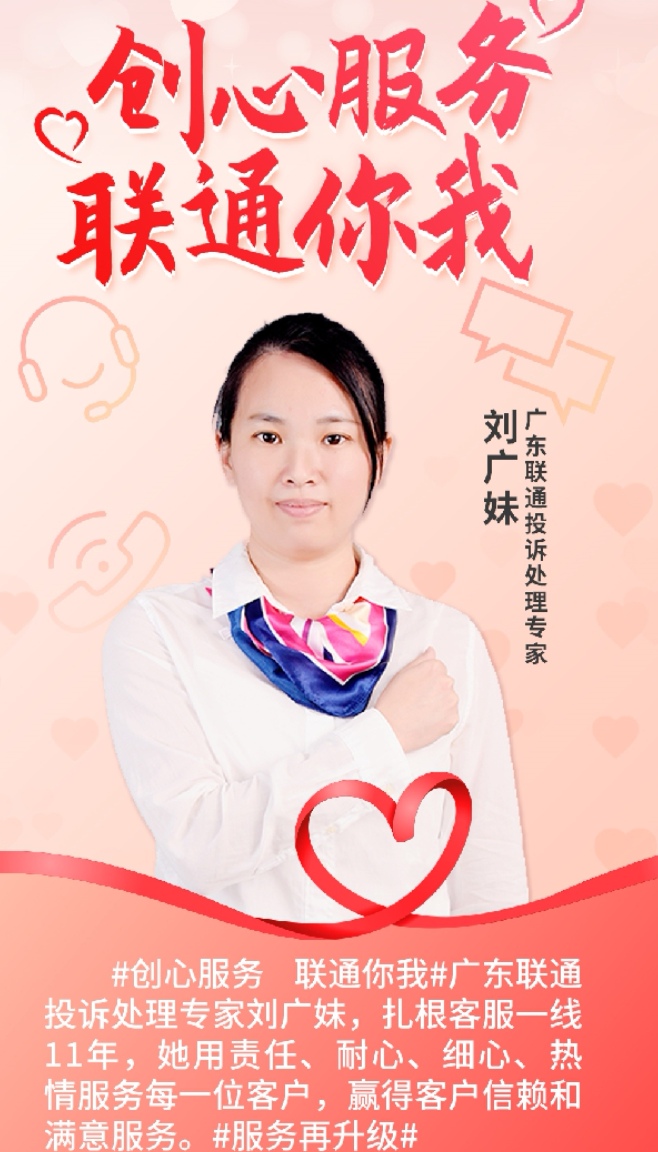 东莞联通投诉处理专家刘广妹, 一直以来秉承“我的百倍用心,愿您十分满意”的服务理念,扎根客服一线11年,从热线话务员到投诉处理专员再到疑难投诉处理专家,她对自己的岗位始终保持热爱,用饱满的热情,勤勤恳恳、兢兢业业,热忱服务好每一位群众。