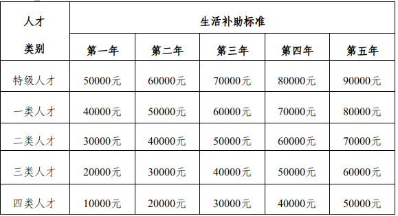 特色人才生活补助按以下标准分5年逐年递增发放。申请人需连续5年每年递交申请一次。因申请人或其所在单位原因中途未提出申请的,相应年度的生活补助不予补办。