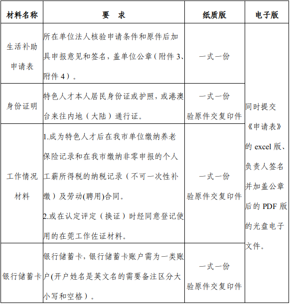 特色人才申请生活补助需提交的材料如下: