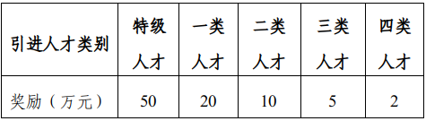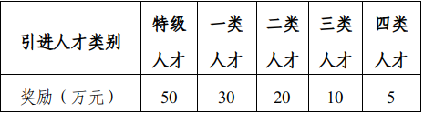 而对于引才单位而言,每引进一名特级人才,可享50万元的引才奖励,每年集中受理申请一次,每个引才单位每年累计最高可获100万元引才奖励资金。详情如下:
