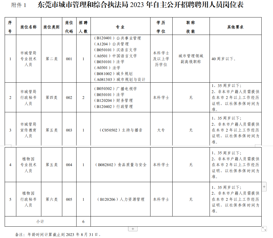 本次招聘市城管局专业技术人员1人、市城管局行政秘书人员2人、市城管局宣传教育人员1人、植物园专业技术人员1人,植物园行政秘书人员1人,合计6人,具体岗位情况和要求见岗位表。