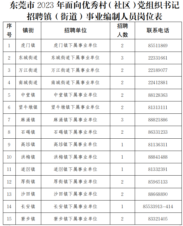 1. 东莞市2023年面向优秀村(社区)党组织书记招聘镇(街道)事业编制人员岗位表