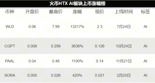 HTX对AI赛道保持持续关注,分别在2023年陆续上新了AI赛道相关的WLD、CGPT、PAAL,并在最近上线了SORA。