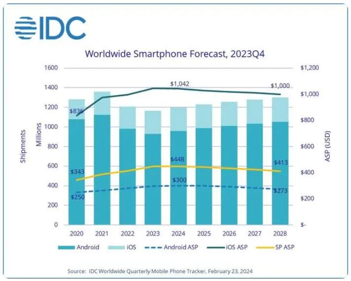 IDC 近日发布市场研究报告,预估 2024 年全球智能手机出货量将达到 12 亿部,同比增长 2.8%,随后到 2028 年将保持较低的个位数增长。