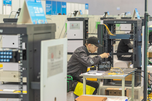 6月24日,在重庆国际博览中心举行的第二届“一带一路”国际技能大赛现场,参赛选手在参加信息网络布线项目比赛。当日,第二届“一带一路”国际技能大赛在重庆国际博览中心拉开帷幕。本次大赛以“技能合作·共同发展”为主题,共设置电子技术、信息网络布线、花艺、珠宝加工、互联网营销等18个项目,共有来自61个国家和地区的选手以及裁判、技术观察员等同台竞技、交流技术。(来源: 经济参考报)