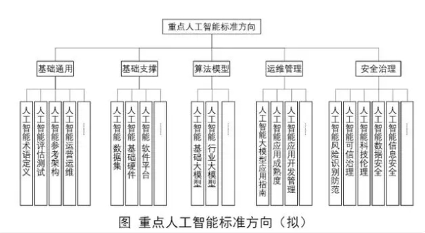 重点人工智能标准方向主要包括基础通用、基础支撑、算法模型、运维管理、安全治理等,如图所示。