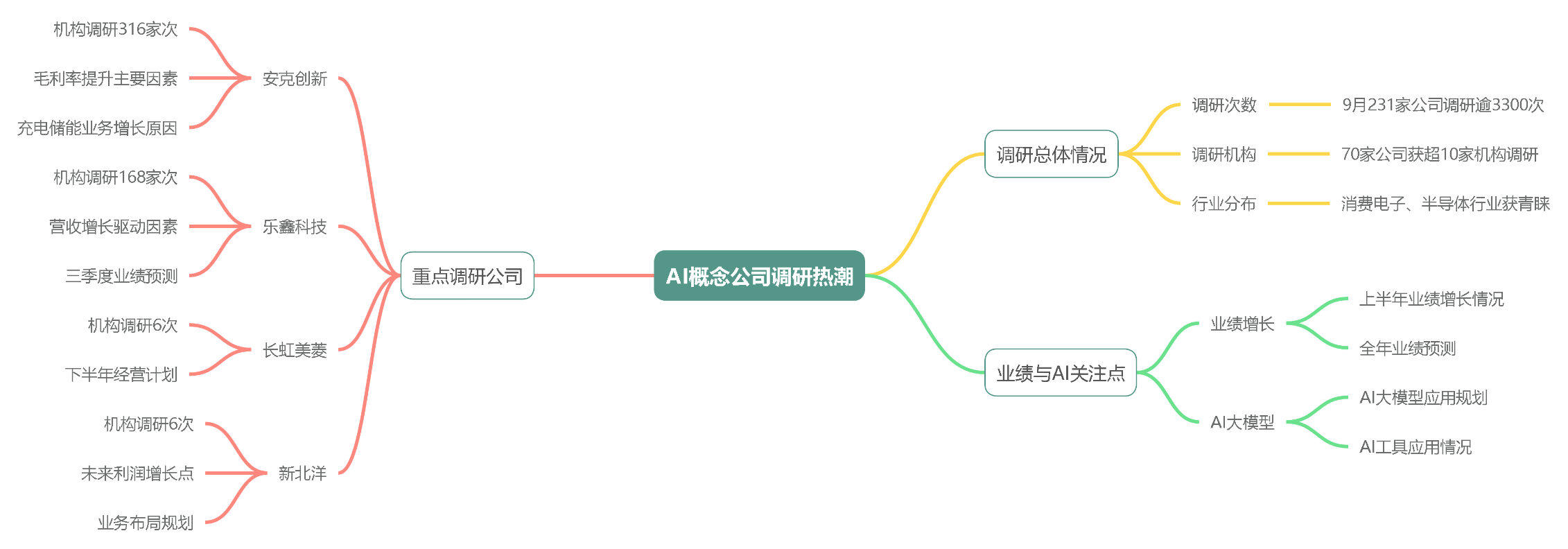 从调研机构数量来看,9月以来,有70家AI概念公司获得了10家以上(含)机构的调研。其中,安克创新、乐鑫科技、凯文教育、石头科技、中控技术、工业富联等6家公司的机构调研家数均超过100家,分别达到316家、168家、136家、135家、102家和102家。从调研次数来看,56家公司接受了两次以上(含)的机构调研,其中长虹美菱、新北洋、航天智装、广日股份、爱科科技、埃夫特等6家公司的调研次数居前,分别为6次、6次、5次、4次、4次和4次。